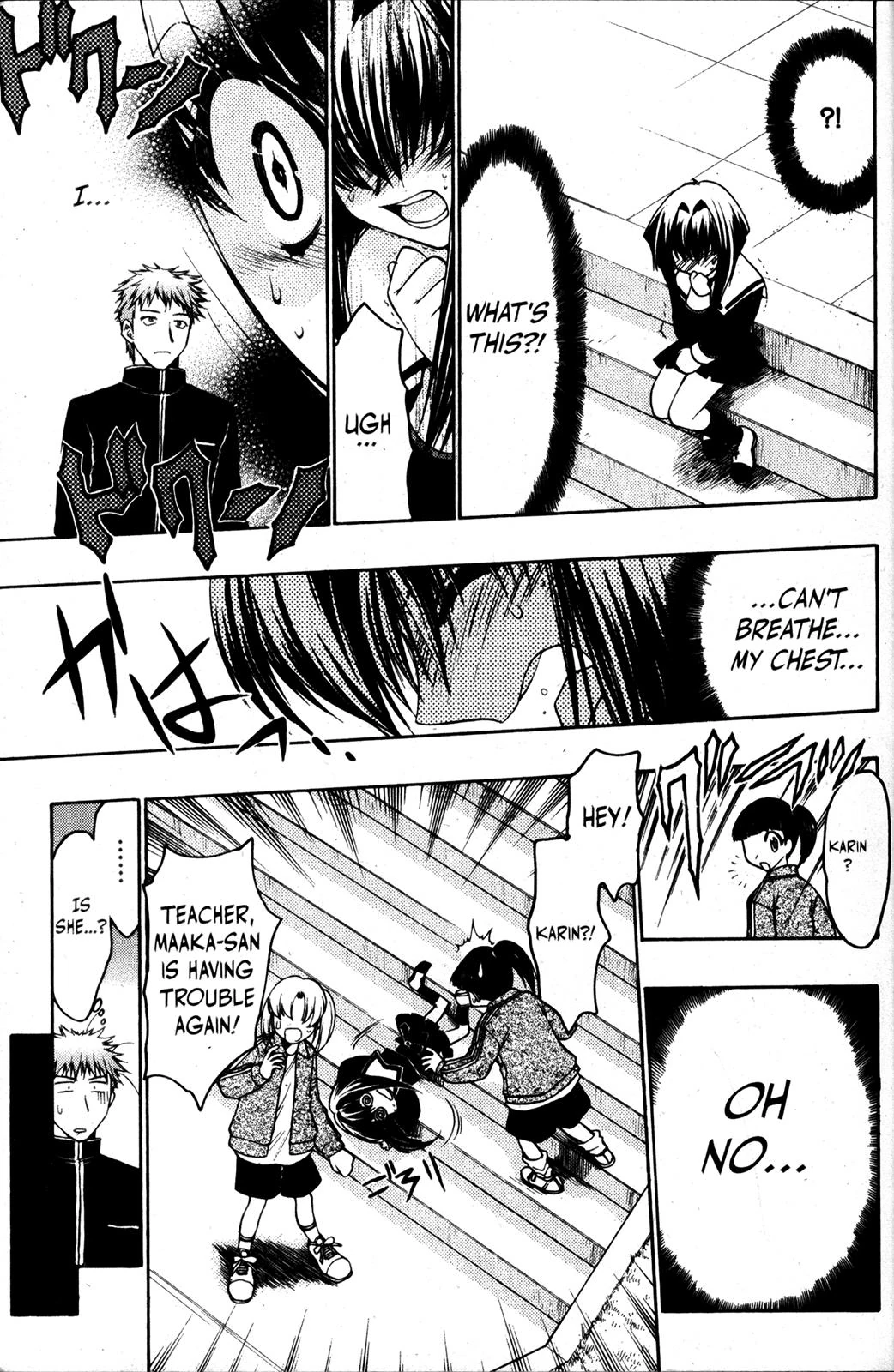 Inside the school Kenta Usui arrives late on his first day as he got lost coming from his apartment, he is chided by the teacher who then offers some advice to go through the park to get to school, he goes with the teacher to where class 1-D is doing PE and introduced as the new transfer student. When he introduced himself to the class Karin starts having trouble breathing and collapsed on the bleachers, to Kenta's confusion. When she awakens she is in her schools health office laying in bed with Maki looking over her, she apologises to Maki and thinks about what caused her to collapse. Maki wonders why Karin doesn't just stay home if she feels unwell and comments how she doesn't mind because she got to miss the rest of PE thanks to her. Karin realises it's just her and Maki in the office and she tries to get Maki to leave but she refuses thinking that she's just trying to take a nap and convinces her to come back to class with her.